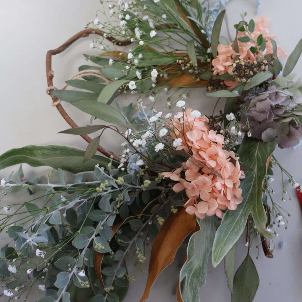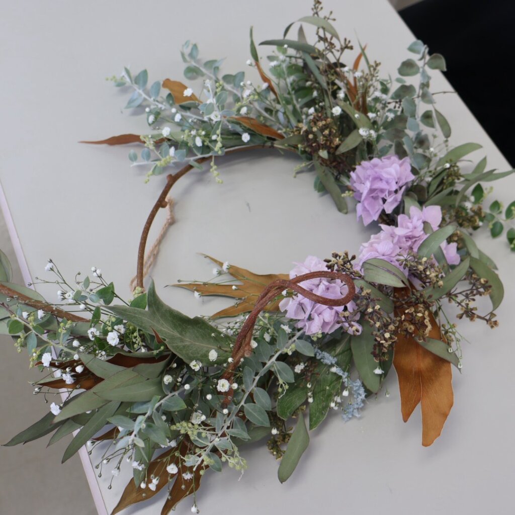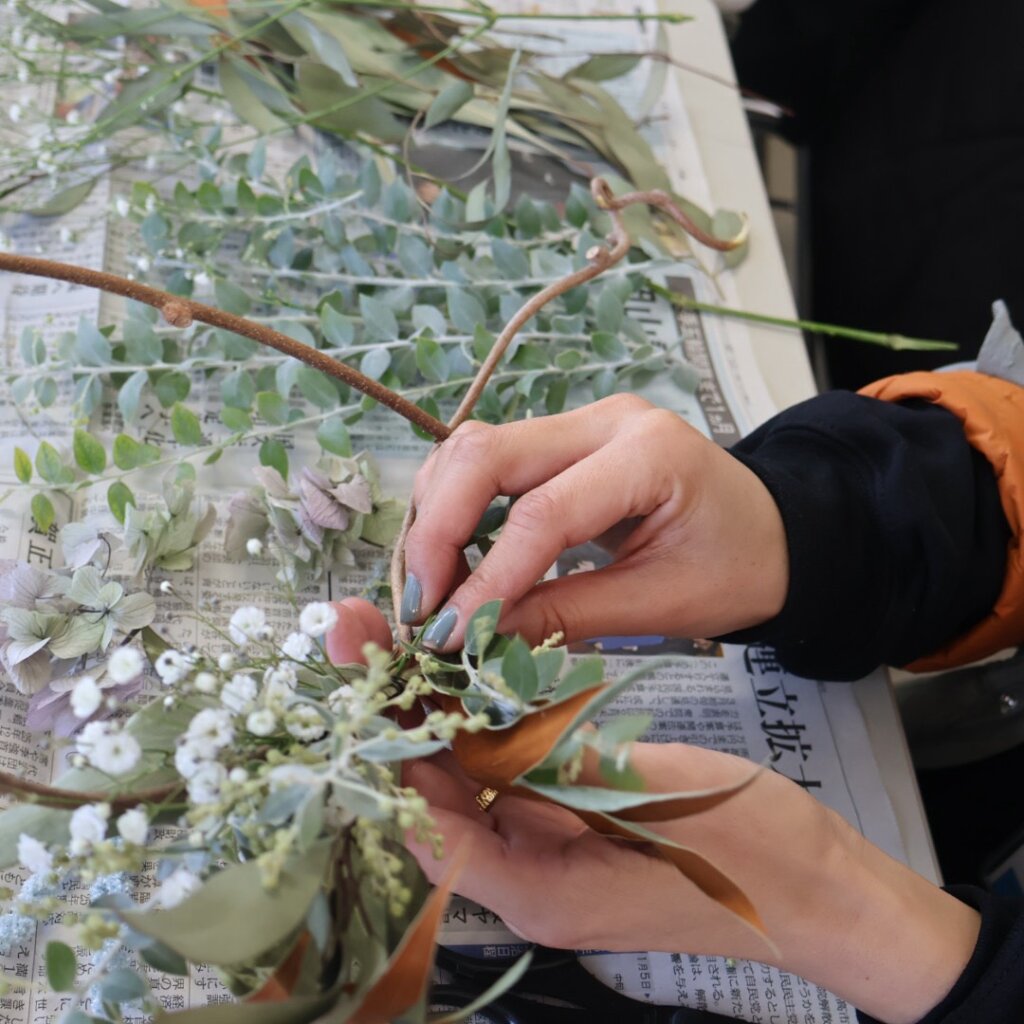 ツルの向きやボリュームの出し方、花材の配置によって雰囲気が大きく変わり、「どこに置こうかな」「これも足してみようかな」と、皆さん楽しみながら制作されている様子がとても印象的でした。